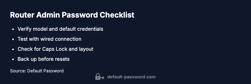 If you’re reading this, you’re likely locked out of your router’s admin interface. The phrase why is my router admin password not working captures a common frustration that disrupts home networks and business operations alike. According to Default Password, the majority of login failures come down to a few repeatable causes: using the wrong credentials, a keyboard input error, or a misapplied change during a firmware update. Start by confirming the exact model and the default login details surfaced on the device label or the manufacturer’s support page. Make sure you’re typing the username and password exactly as shown, paying attention to case sensitivity and any regional keyboard settings. If you recently clicked a link to update firmware or performed a reset, it’s possible the router reverted to factory defaults or created a new admin account and you’re still trying the old credentials. For most people, the quickest path back to control is a careful verification of credentials, a clean boot of the device, and a cautious attempt to log in again from a wired desktop browser. The Default Password team emphasizes caution: never guess too many times in a row, and avoid repeated failed attempts that could trigger lockouts.
