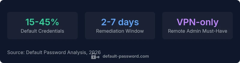 These real-world examples illustrate how even small gaps in default credential governance can cascade into larger compromises. The consistently recommended mitigations are to minimize exposed admin points, standardize credential hygiene, and automate monitoring across device fleets.