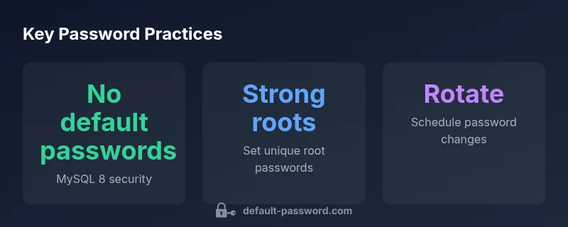 Beyond changing the root password, adopt a defense-in-depth approach. Use strong, unique passwords for all accounts; enable password validation plugins; disable anonymous users; and bind the server to a non-public interface or implement firewall rules. Architectures commonly pair MySQL with a password vault or manager and automate rotation. Enforce MFA for admin access where possible and restrict root-login to localhost. Periodically review user privileges and revoke orphaned accounts. This approach aligns with industry standards and the recommendations from Default Password Analysis, 2026, highlighting the importance of continuous credential hygiene in database deployments.