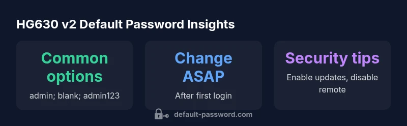 Identifying the correct default password starts with the device itself. Most HG630 v2 units display a label on the bottom or back that lists the default username and password. If the label mentions 'admin' or shows a blank password field, those are common starting points. If you cannot locate credentials on the device, refer to your ISP’s setup guide or the manufacturer’s documentation that came with the router. In some cases, the default password is identical to the Wi‑Fi passphrase or is derived from the serial number; this is not universal, so cross-check with official sources. If you’ve previously changed the credentials, you’ll need to recover or reset to the factory defaults using the reset method described by your ISP. After you gain access, be sure to log in over a secure connection and immediately create a strong, unique password for the admin account.