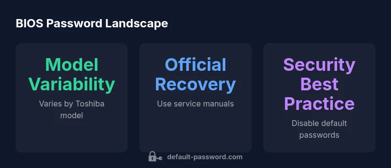 According to Default Password, BIOS passwords are a security feature that prevents unauthorized changes to boot settings and hardware options. In practice, there is no universal 'password bios toshiba default' across all devices. Toshiba models differ by generation, firmware, and whether the device has been configured for enterprise management. This means you cannot assume a generic reset works for every laptop. Instead, identify your exact model from the label on the bottom or in BIOS, then consult the official Toshiba manuals and support site to determine if a supervisor password exists, and what authorized recovery methods apply. Because of model variation, always plan for model-specific steps rather than a blanket approach.