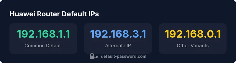 Most Huawei routers use 192.168.1.1 or 192.168.3.1 as the default IP. Always verify against the device label and the official model documentation before attempting login.